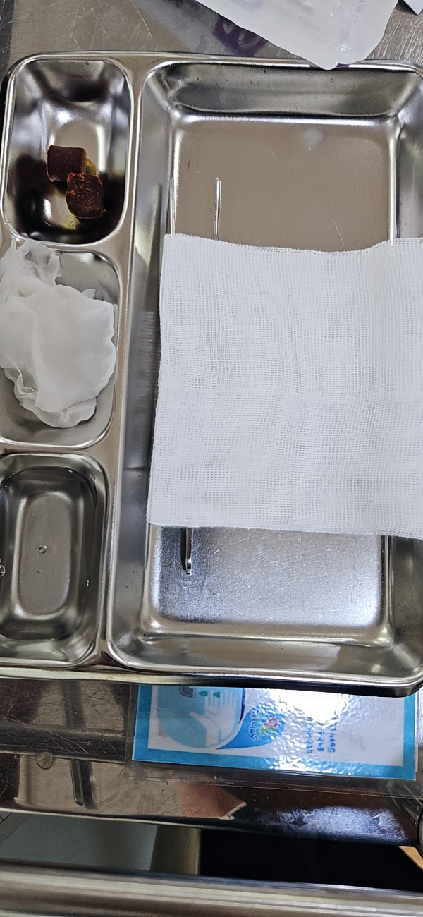 아. 겸자(포셉)를 이용해 소독솜을 쥐고 닦되 위 에서부터 밑(요도에서 항문 쪽으로)으로 대음순을 닦은 후 소음순을 일방향으로만 닦고 한번 닦을 때마다 새 소독솜으로 바꿔 사용한다.