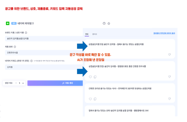 - 브랜드를 파워링크 광고를 하기 위해 키워드 입력하면 어떤 문구로 광고를 해야할지 자동생성 한번으로 바로 광고문구를 확인할 수 있다.