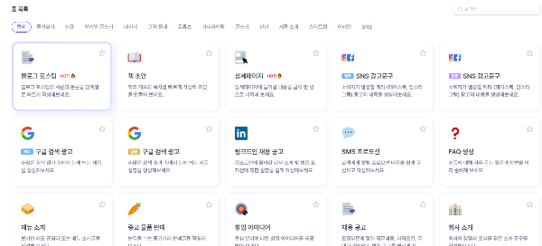 - 카피라이팅, 유투브제목, 소개글, 상세페이지 내용, 블로그, SNS 광고 등 최대 45개의 글쓰기 서비스를 제공한다.