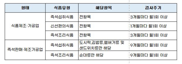 각 식품유형에 따라 검사항목과 내용이 달라집니다.