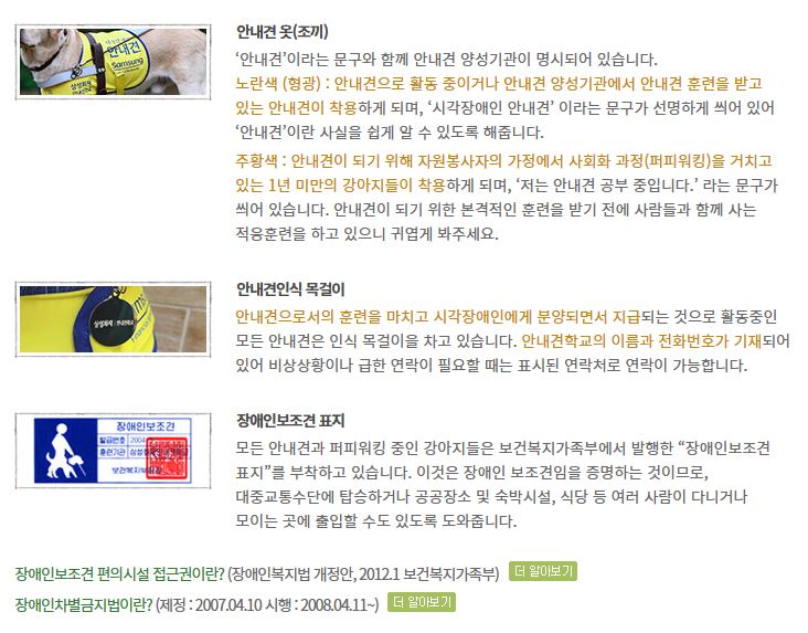 - 활동 중인 모든 안내견은 보건복지부가 발행한 ‘장애인 보조견 표지’를 부착하고 있습니다.