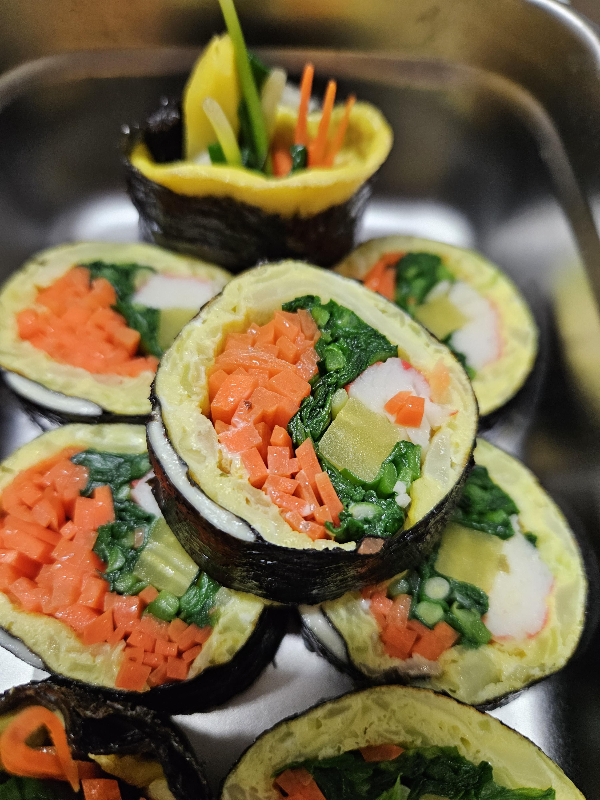 10. 양배추채 달걀전 깔고 위에 당근, 부추, 단무지, 크래미 올리고 돌돌 말아줍니다.