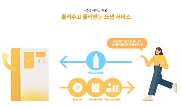 - 쓰샘에다가 라벨을 제거한 투명 페트병을 투입하면 포인트 적립, 종량제 봉투 교환 등으로 보상 받을 수 있습니다.